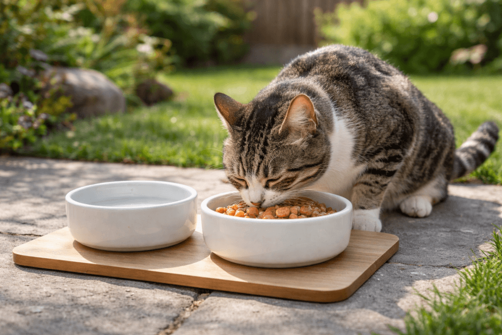 Texture is softer once mixed. That can be helpful for older cats or cats with dental issues. It also makes it easier for some cats to eat quickly and move on, which matters when feeding outdoors where food shouldn’t sit out long.